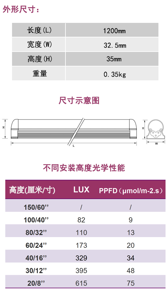 ● 高質量的鋁制外殼,無需附加散熱裝置 ● 100-240V高效內置驅動 ● 120°光束角分布 ● 雛菊鏈連接 ● 有CE/ROHS認證,壽命達50000小時 ● 光譜類型:紅藍光